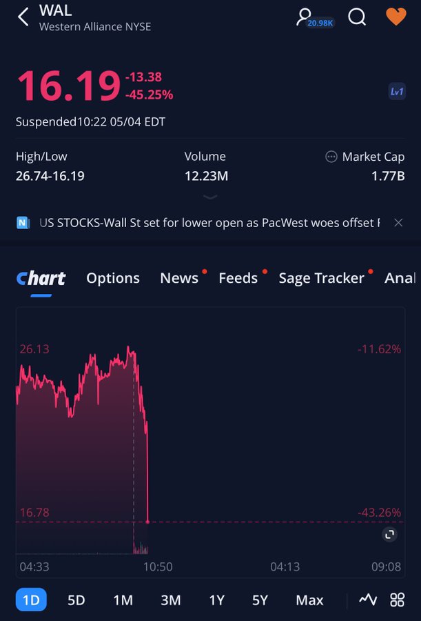 WESTERN ALLIANCE BANK IS IN FREE FALL HALTED TWICE IN THE LAST 5 MINUTES NOW DOWN OVER 45% TODAY $WAL pic.twitter.com/3oHY6beIPg