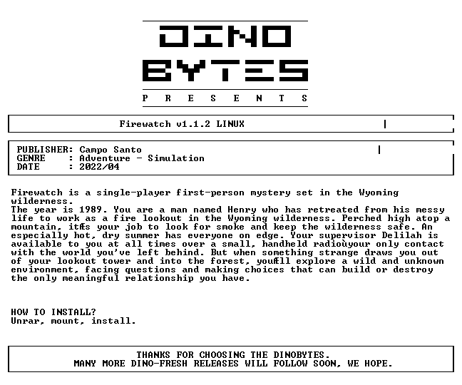 The year is 1989. You are a man named Henry who has retreated from his messy life to work as a fire lookout in the Wyoming wilderness. Perched high atop a mountain, it’s your job to look for smoke and keep the wilderness safe. An especially hot, dry summer has everyone on edge. Your supervisor Delilah is available to you at all times over a small, handheld radio—your only contact with the world you've left behind. But when something strange draws you out of your lookout tower and into the forest, you’ll explore a wild and unknown environment, facing questions and making choices that can build or destroy the only meaningful relationship you have.