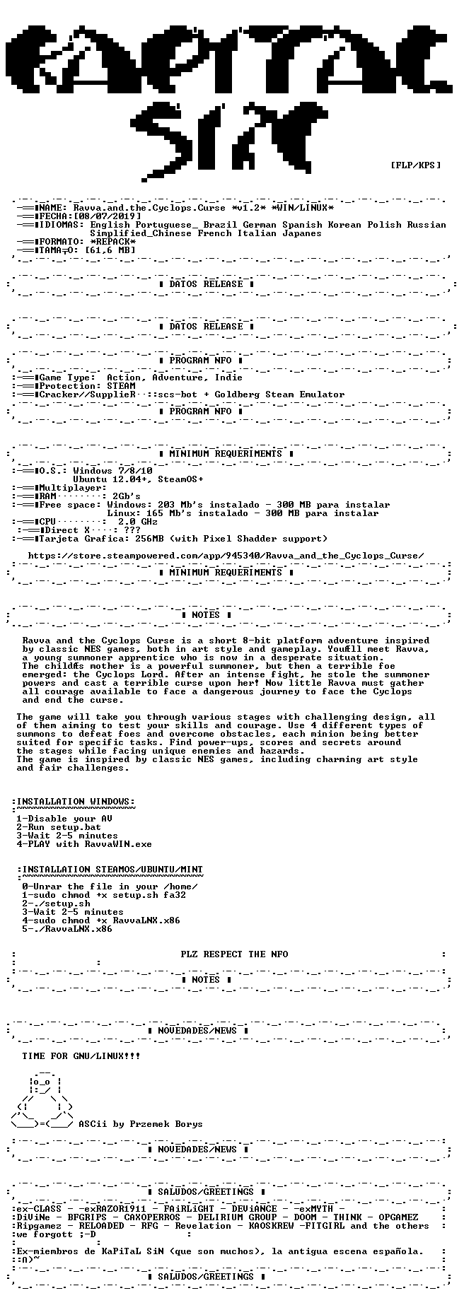 "Ravva and the Cyclops Curse es una corta aventura de plataformas en 8-bits inspirada en los clásicos juegos de NES, tanto en el estilo artístico como en la jugabilidad. Conocerás a Ravva, un/a joven aprendiz de invocador/a que se encuentra en una situación desesperada. La madre de la criatura es una poderosa invocadora, pero entonces un rival terrible emergió: el Señor Cíclope. Después de una intensa pelea, ¡ha robado los poderes de invocador y le ha conjurado a la propia invocadora una terrible maldición! Ahora Ravva deberá reunir todo el coraje disponible para partir en un viaje peligroso para enfrentarse al Cíclope y destruir la maldición.